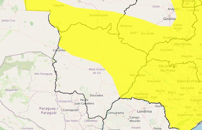 O aviso é vigente desta manhã às 10h de quarta-feira (10), com grau de severidade de perigo potencial para chuva de 20 a 30 milímetros por hora ou até 50 milímetros ao dia, com ventos intensos de 40 a 60 km/h.