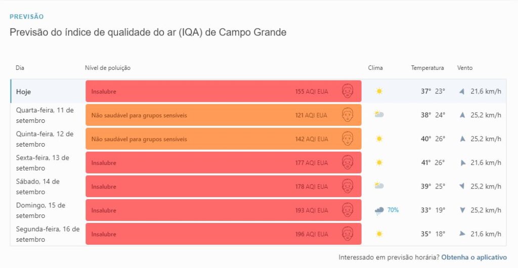 Apesar de já marcar um índice alto do IQA, com condições consideradas insalubres, Campo Grande terá uma piora na qualidade do ar. O mesmo site indica que na quarta e quinta-feira o índice será de 121 e 142.