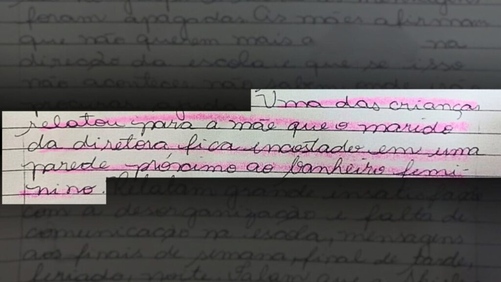 Na reunião, mães questionam a gestão atual da escola, incluindo a presença do marido da diretora “participando efetivamente dos eventos, como se fosse funcionário”. Na ata, consta ainda que há crianças com receio da presença do homem na escola e as representantes da Semed afirmam que a situação será acompanhada.