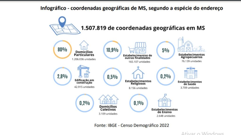 Os dados do Censo 2022 mostram que, em Mato Grosso do Sul, 80% dos endereços são domiciliares individuais. Na prática, são 1,2 milhão de endereços particulares e 3.109 (ou 0,2%) de domicílios coletivos.