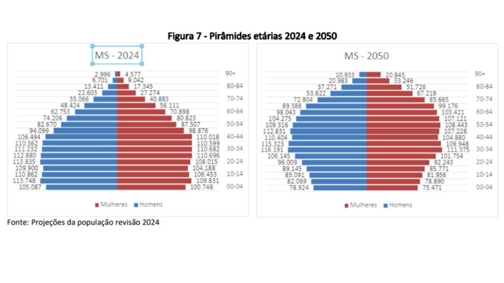 A população do Estado deve envelhecer, devido à queda no número de nascimentos. E, em 2050, a tendência é de que o número de óbitos supere a quantidade de nascimentos. Em 2070, o IBGE projeta que o percentual da população de MS com 65 anos ou mais de idade chegue a 27,3% (846 mil idosos). Em 2024, essa proporção é de 9,8% (284 mil) idosos.