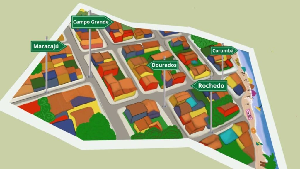 São 17 cidades homenageadas. Amambaí, Bandeirantes, Bela Vista, Brasilândia, Bonito, Campo Grande, Caracol, Cassilândia, Corumbá, Dourados, Iguatemi, Itaporã, Jateí, Maracaju, Paranaíba, Ponta Porã, Rio Negro e Rochedo. Peças que montam uma espécie de mapa invertido onde ‘os municípios de MS’ aparecem em meio ao cenário litorâneo. Já pensou Campo Grande a poucas quadras do mar?