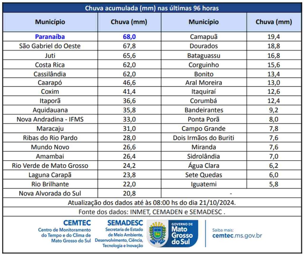 Conforme os dados do Cemtec (Centro de Monitoramento do Tempo e do Clima), a cidade mais chuvosa foi Paranaíba, após dias de calor intenso beirando os 40°C. Em seguida, está São Gabriel do Oeste (67,8 mm), Juti (65,6 mm) e Costa Rica (62 mm).