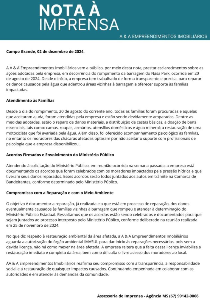 Após reportagem do Jornal Midiamax, que relatou acordos feitos entre a A & A Empreendimentos Imobiliários, responsável legal pelo Nasa Park, e os moradores que tiveram as residências destruídas pela água da barragem do loteamento, que rompeu em agosto, a empresa se manifestou sobre tais negociações.