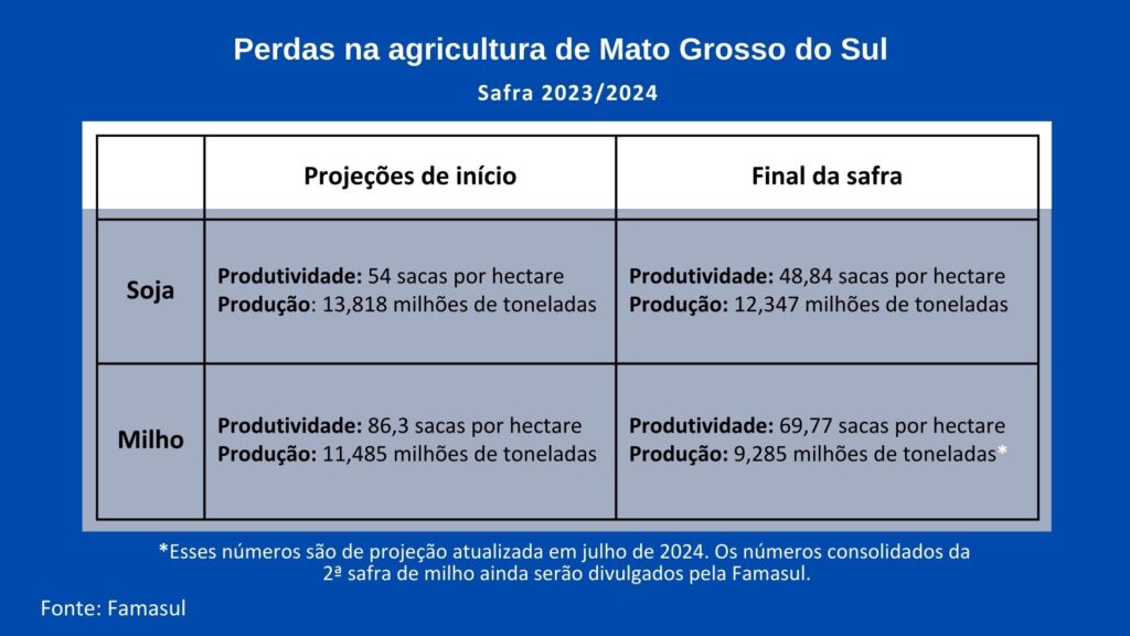 Esse tipo de prejuízo deverá se repetir agora, no final de setembro de 2024, no encerramento da 2ª safra de milho. No início do ciclo, projetava-se produção de 11,485 milhões de toneladas do grão e produtividade de 86,3 sacas por hectare.
