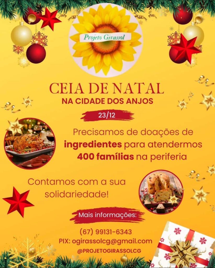 Organizadores do projeto “Ceia na Periferia”, realizada pelo Projeto Girassol, que no ano passado atendeu mais de 300 pessoas na comunidade Cidade dos Anjos, região do Bairro Los Angeles em Campo Grande, pedem doações de alimentos. Na ação é servido jantar para adultos e crianças. No ano passado, o cardápio foi arroz, rondelli, frango assado, refrigerantes e sorvete. A ceia neste ano, do projeto que vai para o quinto ano, será novamente na Cidade dos Anjos, no próximo dia 23. Quem quiser ajudar, pode entrar em contato pelo 67 – 99131 – 6343.