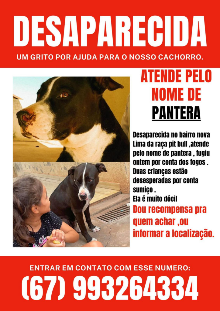 Ainda conforme o tutor, há uma recompensa de R$ 200,00 para quem encontrar Pantera. Qualquer informação encaminhe no número: (67) 99326-4334.