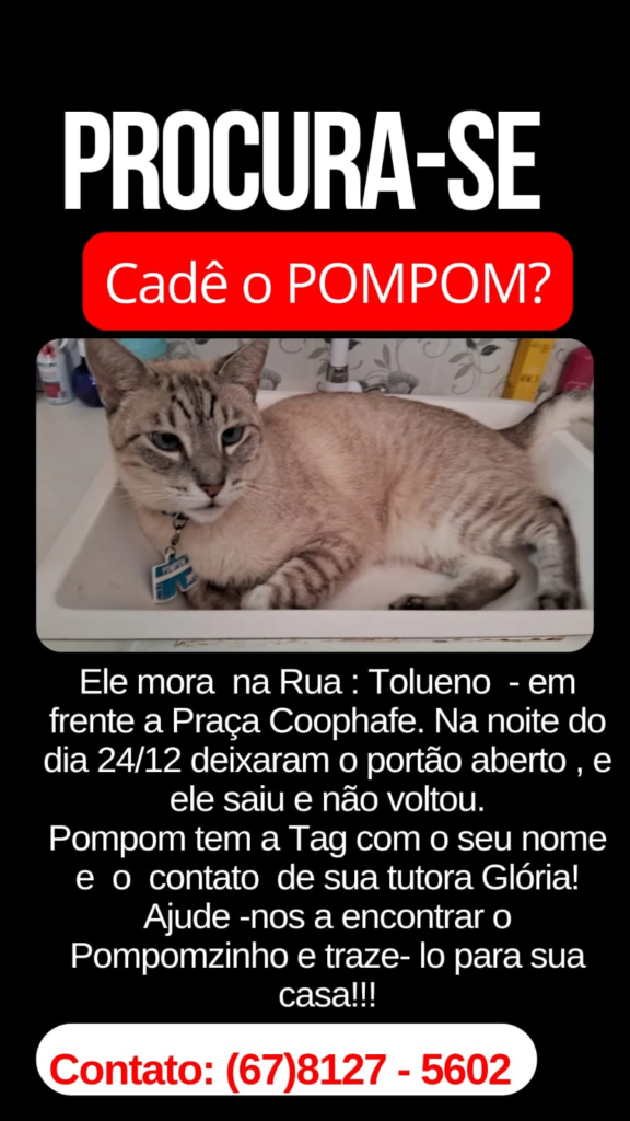 No Coophafé o gatinho Pompom também sumiu durante as festividades de Natal. O gato desapareceu no dia 24 de dezembro, nas imediações da rua Tolueno, em frente a praça Coophafé, após deixarem o portão aberto.