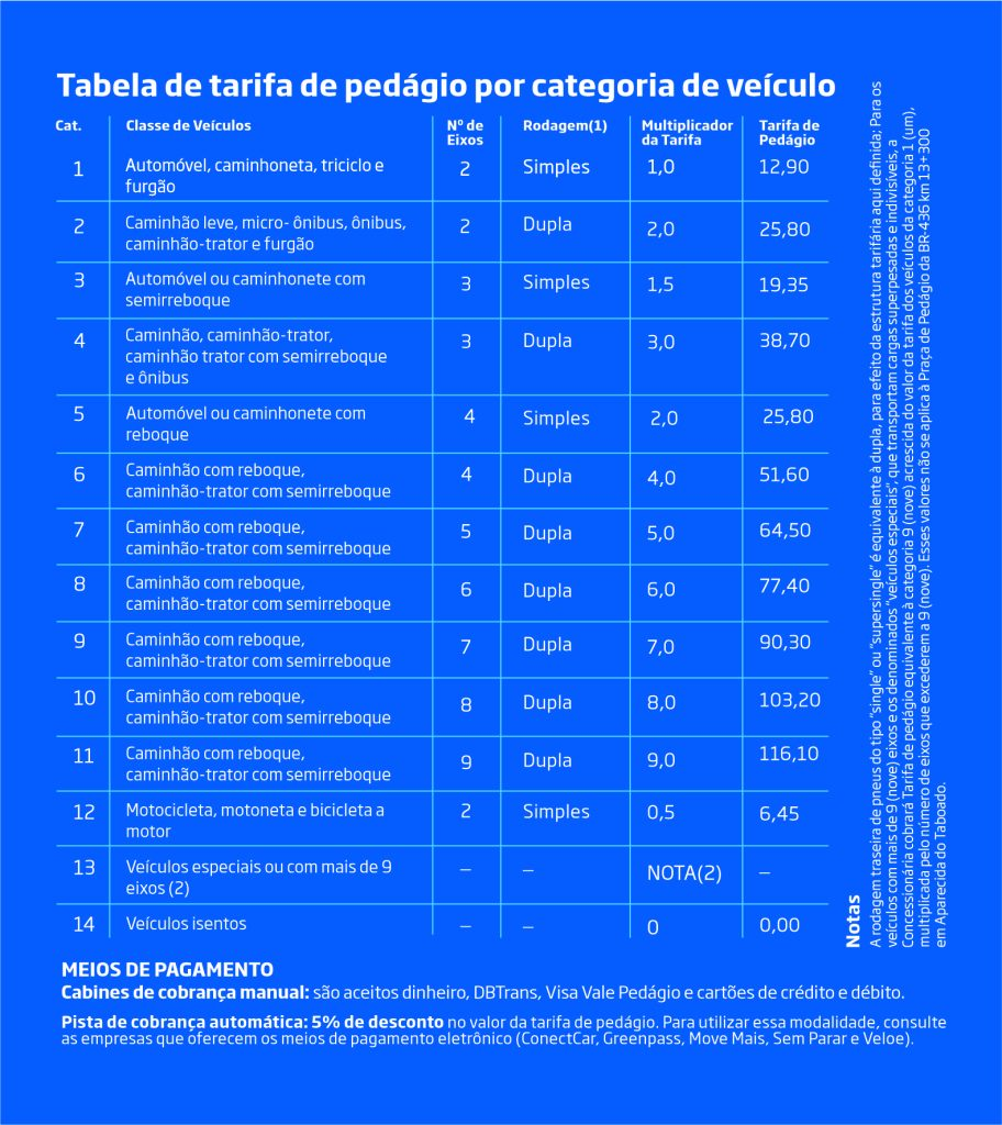 Conforme a tabela de preços estabelecida, as tarifas variam de R$ 6,45 para motos e bicicletas a R$ 116,10 para caminhões com nove eixos. Confira:
