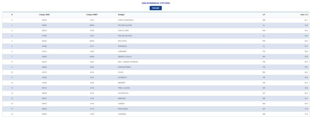 A região sudoeste de Mato Grosso do Sul ainda ultrapassa o Alagoas e Rondônia. Água Clara ocupa o terceiro lugar do ranking com 39,4°C. Em 13ª posição está Três Lagoas (38,2°C), na 15ª está Miranda (38,1°C), em seguida Jardim (38°C).