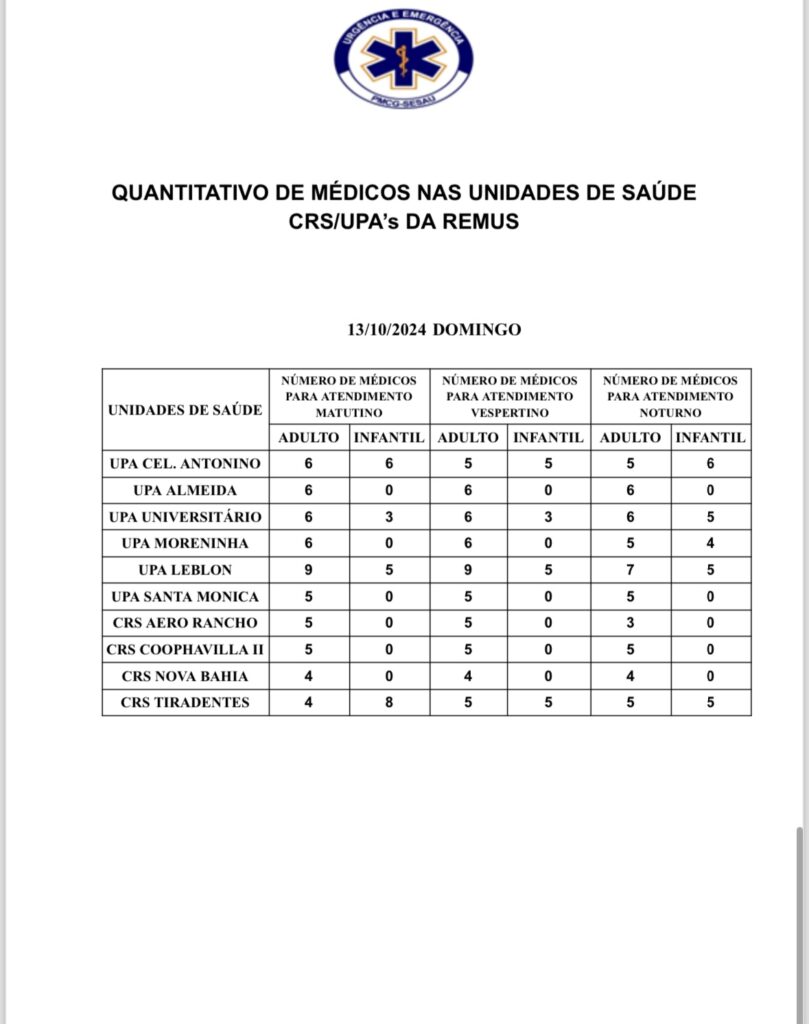 Pela manhã, a equipe disponibilizará 56 clínicos gerais para atender adultos e 22 para crianças em casos de urgência e emergência. Já no período da tarde, serão 56 profissionais para adultos e 18 para crianças. Além disso, no período da noite, a população contará com 51 clínicos gerais e 25 pediatras.