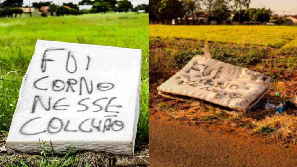 O segundo colchão apareceu oito meses depois na mesma região com um recado que parece um desdobramento do primeiro objeto abandonado. Em letras garrafais estava escrito “fui corno de novo”.