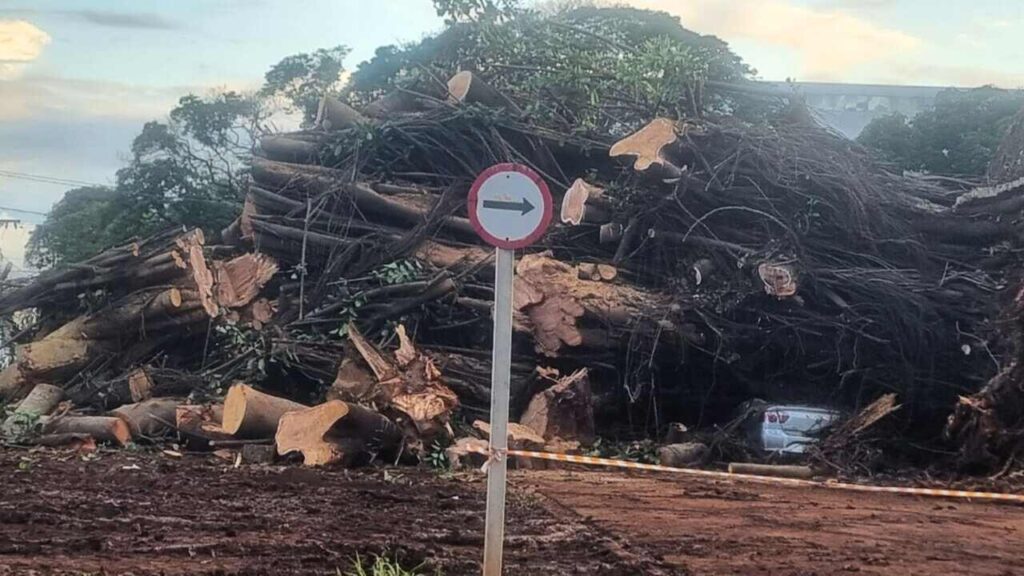 Cinco carros e duas casas foram total ou parcialmente destruídos pela queda da árvore no bairro Jardim Paulista, região central de Dourados. Os prejuízos ainda serão calculados, considerando que deve levar dois dias para que a árvore seja retirada do local.