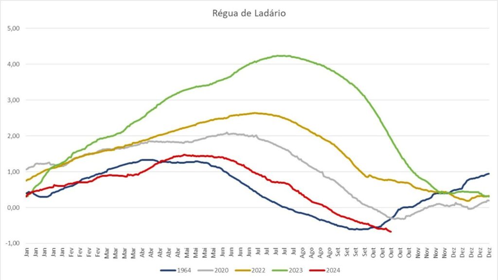 Historicamente, outubro é um mês de seca, a questão é que em 2024 não houve cheia e as chuvas estão abaixo da média histórica. Para se ter ideia, em 15 de outubro de 2023, o nível do Rio Paraguai, em Ladário, era de 1,93 metros.