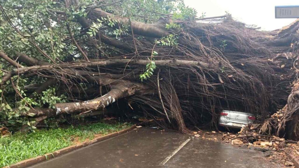 Cinco carros e duas casas foram total ou parcialmente destruídos pela queda da árvore no bairro Jardim Paulista, região central de Dourados. Os prejuízos ainda serão calculados, considerando que deve levar dois dias para que a árvore seja retirada do local.