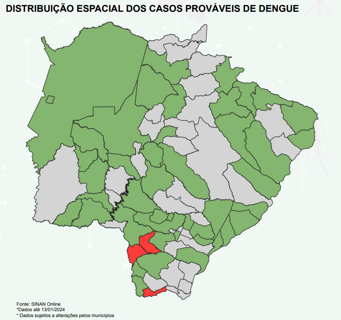 Três dos 79 municípios já registram alta incidência de casos prováveis de dengue, quando a taxa fica acima de 300 casos por 100 mil habitantes. Em primeiro lugar está Sete Quedas, seguida por Aral Moreira e Laguna Carapã.