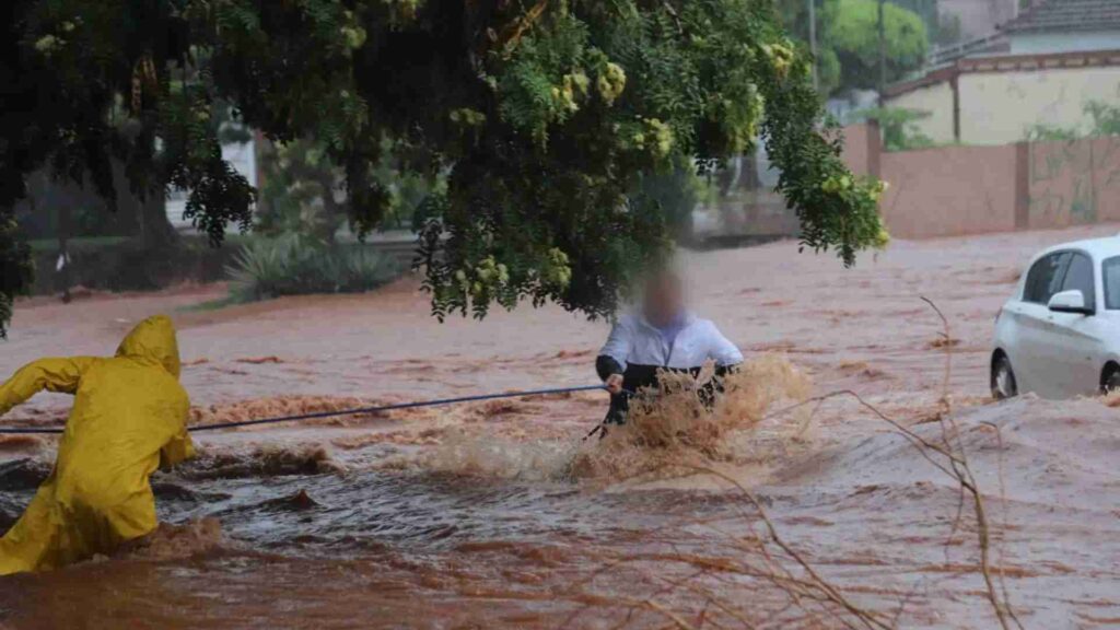 O motorista precisou ser socorrido por populares com a ajuda de uma corda para fugir da enxurrada. A BMW apagou enquanto tentava atravessar o cruzamento e ficou parcialmente coberta pela água.