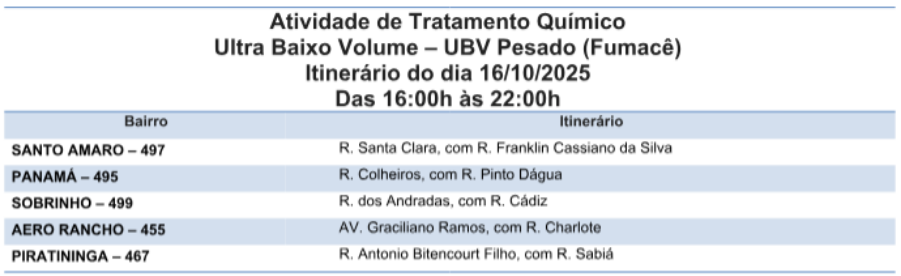 O fumacê visa conter a proliferação do mosquito Aedes aegypti, que também transmite zika e chikungunya. Conforme a CCEV (Coordenadoria de Controle de Endemias Vetoriais), das 16h às 22h, as equipes intensificam a desinfecção nos bairros: Santo Amaro, Panamá, Sobrinho, Aero Rancho e Piratininga.