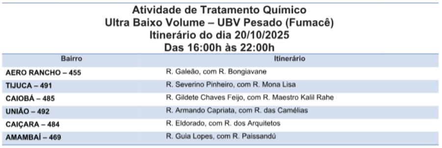 O fumacê visa conter a proliferação do mosquito Aedes aegypti, que também transmite zika e chikungunya. Conforme a CCEV (Coordenadoria de Controle de Endemias Vetoriais), das 16h às 22h, as equipes intensificam a desinfecção nos bairros: Aero Rancho, Tijuca, Portal Caiobá, União, Caiçara e Amambaí.