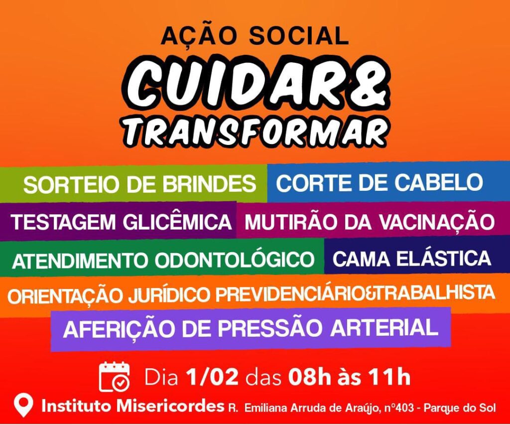 A ação é uma oportunidade dos moradores receberem cuidados de saúde e beleza gratuitamente. Ela ocorrerá na Sede do Instituto Misericordes, localizado na Rua Emiliana Arruda de Araújo, nº 403, Parque do Sol, das 8h às 11h da manhã do dia 1º de fevereiro.