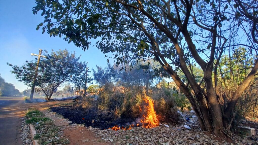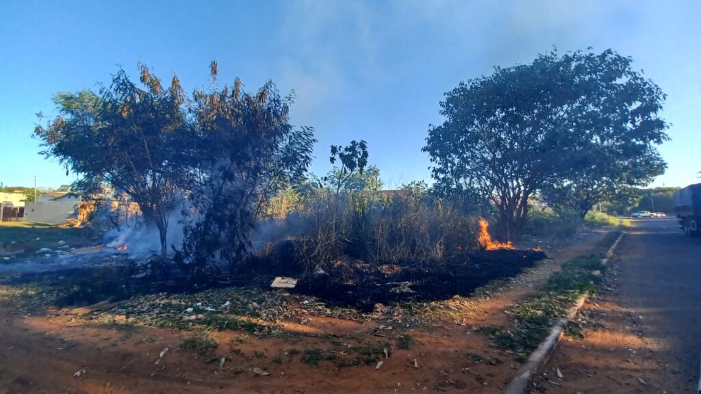 Próximo ao Parque Ayrton Senna, no bairro Aero Rancho, um foco de incêndio foi registrado em uma área de descarte irregular, com a queima de entulho e restos de poda de árvores.