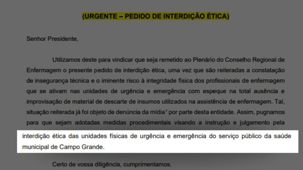 No documento, solicita que o órgão avalie pedido de interdição ética das unidades físicas de urgência e emergência da saúde pública de Campo Grande. O sindicato alega e insegurança técnica e o iminente risco à integridade física dos profissionais de enfermagem que atuam nas unidades.
