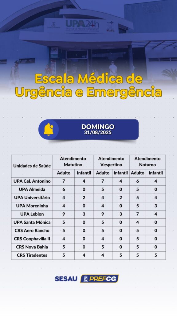 A Sesau (Secretaria de Saúde de Campo Grande) divulgou a escala médica de dez unidades de saúde com atendimentos médicos para adultos e crianças neste domingo (31). Os atendimentos são divididos por turnos.