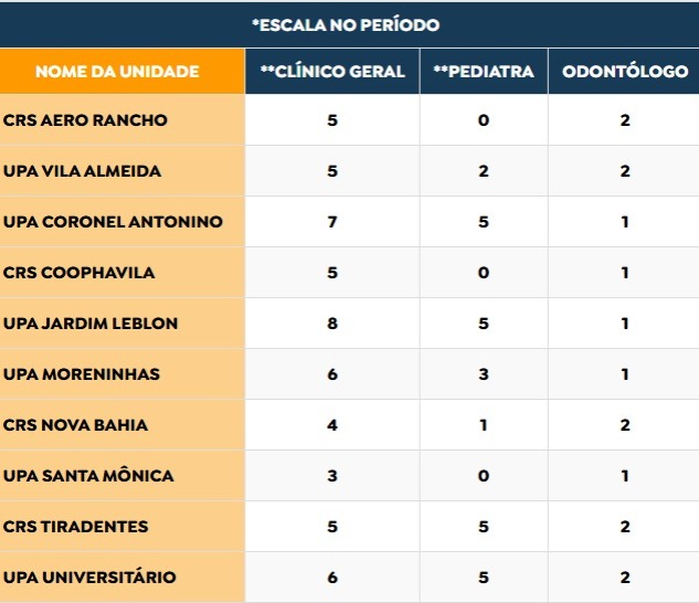 Conforme a escala, são 53 clínicos gerais, 26 pediatras e 15 dentistas, e os atendimentos ocorrem nas seguintes UPAs: Cel. Antonino, Vila Almeida, Universitário, Moreninha, Leblon, Santa Mônica, Aero Rancho, Coophavilla II, CRS Nova Bahia e CRS Tiradentes.