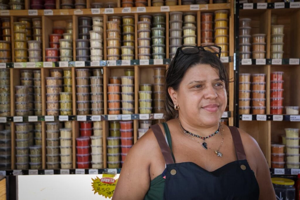 Débora Pereira Borges, de 48 anos, e Gerônimo Borges, de 51 anos, participam da feira há dois anos. Eles trabalham com uma grande variedade de produtos, mas o forte fica por conta dos temperos. “Temos mais de 100 variedades. Alguns a gente compra e fraciona, mas a maioria, ele [Gerônimo] faz”, explica Débora.