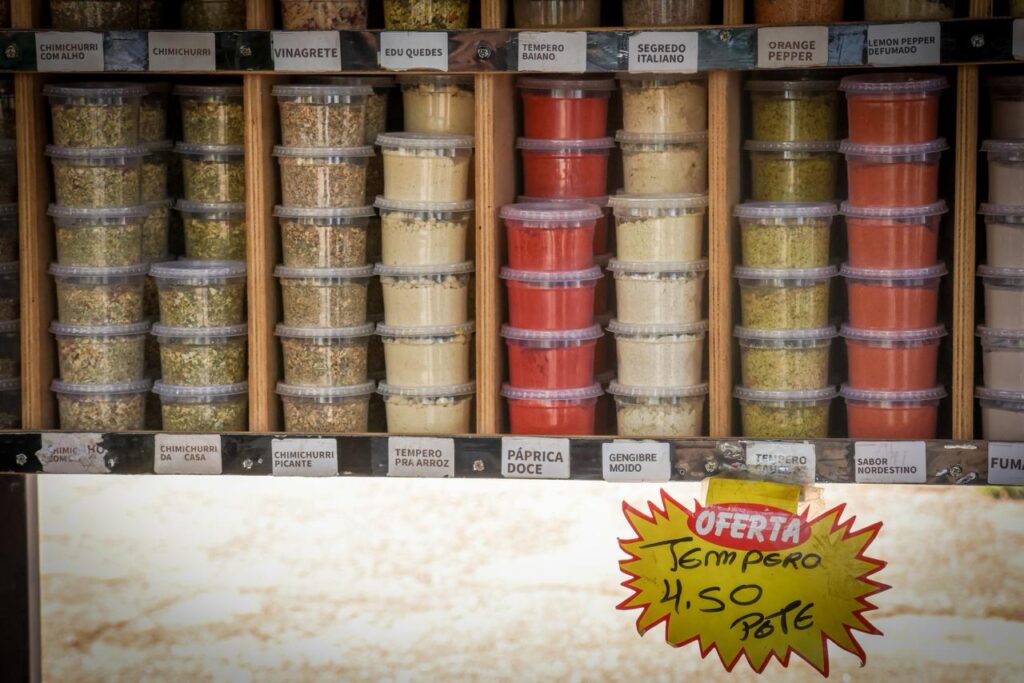 Débora Pereira Borges, de 48 anos, e Gerônimo Borges, de 51 anos, participam da feira há dois anos. Eles trabalham com uma grande variedade de produtos, mas o forte fica por conta dos temperos. “Temos mais de 100 variedades. Alguns a gente compra e fraciona, mas a maioria, ele [Gerônimo] faz”, explica Débora.