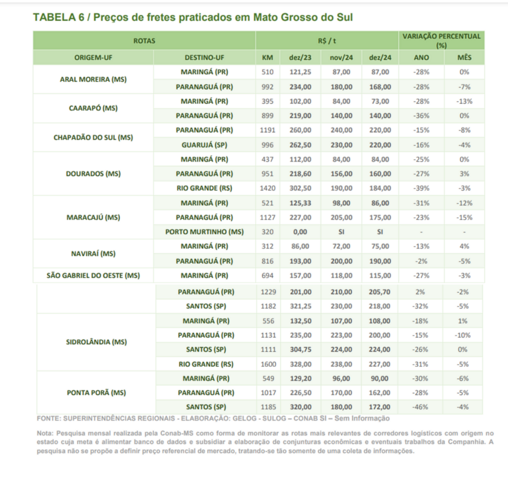 O preço do frete em Mato Grosso do Sul apresentou oscilações negativas em função da disponibilidade de produto para movimentação no mês de dezembro de 2024. A informação consta na edição de janeiro do Boletim Logístico, divulgado nesta quarta-feira (29) pela Conab (Companhia Nacional de Abastecimento).
