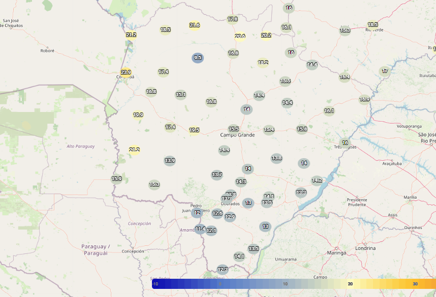 De acordo com o Inmet (Instituto Nacional de Meteorologia), a menor temperatura foi marcada na estação localizada na Fazenda Campo Zélia, em Corumbá. Também tiveram mínimas baixas as cidades de Aral Moreira (11,4°C), Ponta Porã (12°C), Amambai (12,1°C), Laguna Carapã (12,6°C) e Caarapó (12,9°C).