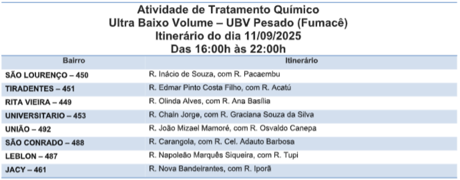 Nesta quinta-feira (11), o serviço de borrifação UBV (ultrabaixo volume), também conhecido como fumacê, será reforçado em oito bairros de Campo Grande. O objetivo é combater o mosquito Aedes Aegypti, transmissor de doenças como dengue, zika e chikungunya.
