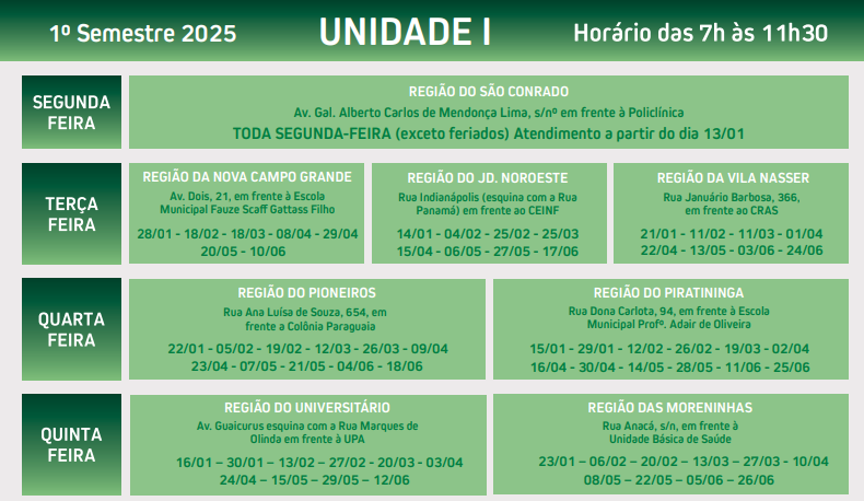 Para fechar a primeira semana de atendimentos de 2025, a região do Universitário será atendida pela Unidade I na quinta-feira (16), com o ônibus estacionado na Avenida Guaicurus (esquina com a Rua Marques de Olinda), em frente à UPA.