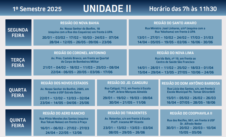 No mesmo dia, a Unidade II atenderá à população na região do Aero Rancho, em frente à praça localizada na Rua Plínio Mendes dos Santos (esquina com a Rua Tokuei Nakao).