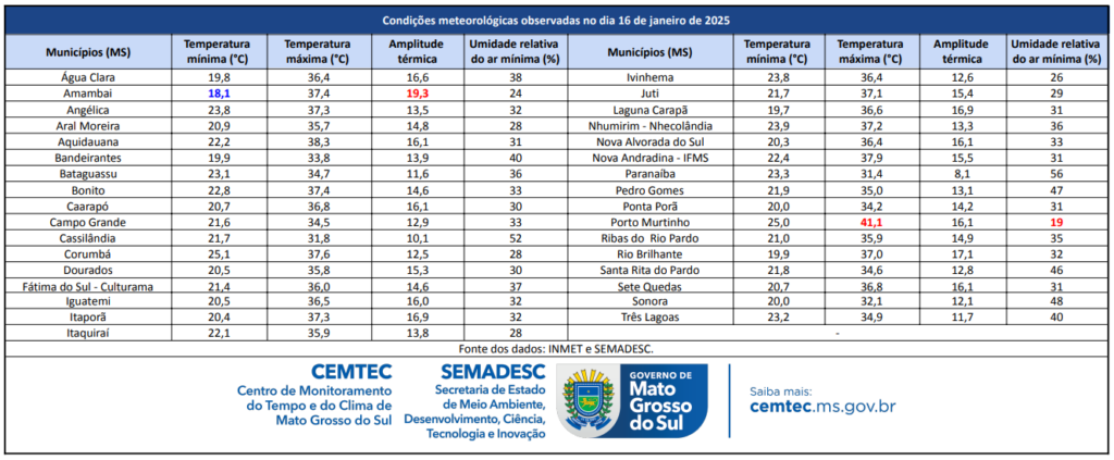 Porto Murtinho continua campeã em valores extremos, tanto em umidade do ar como em temperaturas. Pelo 9° consecutivo, a cidade marca máxima acima de 40°C e umidade do ar em 19%.