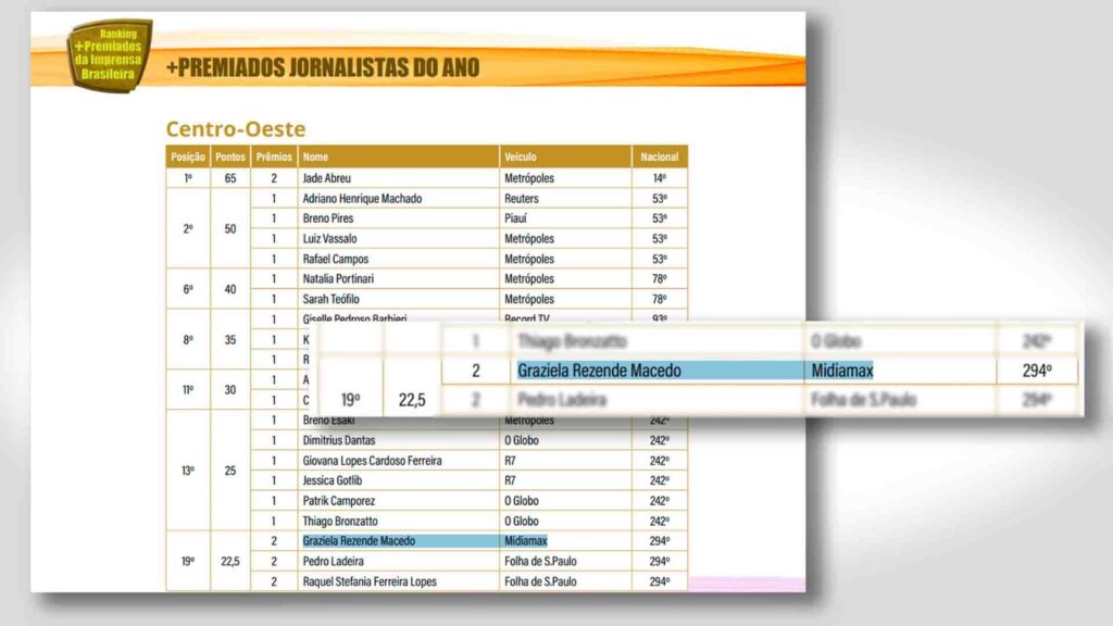 Graziela Rezende, que compõe a equipe jornalística, também é apontada como uma das jornalistas mais premiadas do centro-oeste brasileiro, ainda segundo o ranking. No ano de 2024, acumula quatro prêmios, sendo três regionais e um nacional.