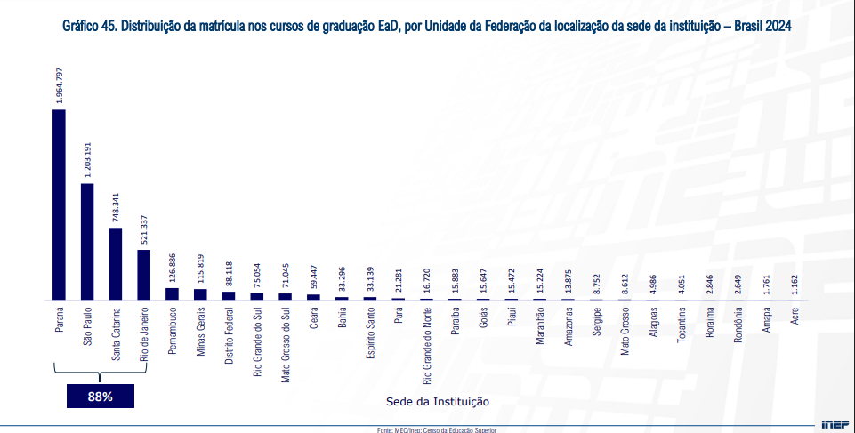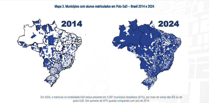 Em 2024, a matrícula na modalidade EaD estava presente em 3.387 municípios brasileiros (61%), por meio de campi das instituições de ensino superior ou de polos, alta de 97%, se comparado com o ano de 2014.
