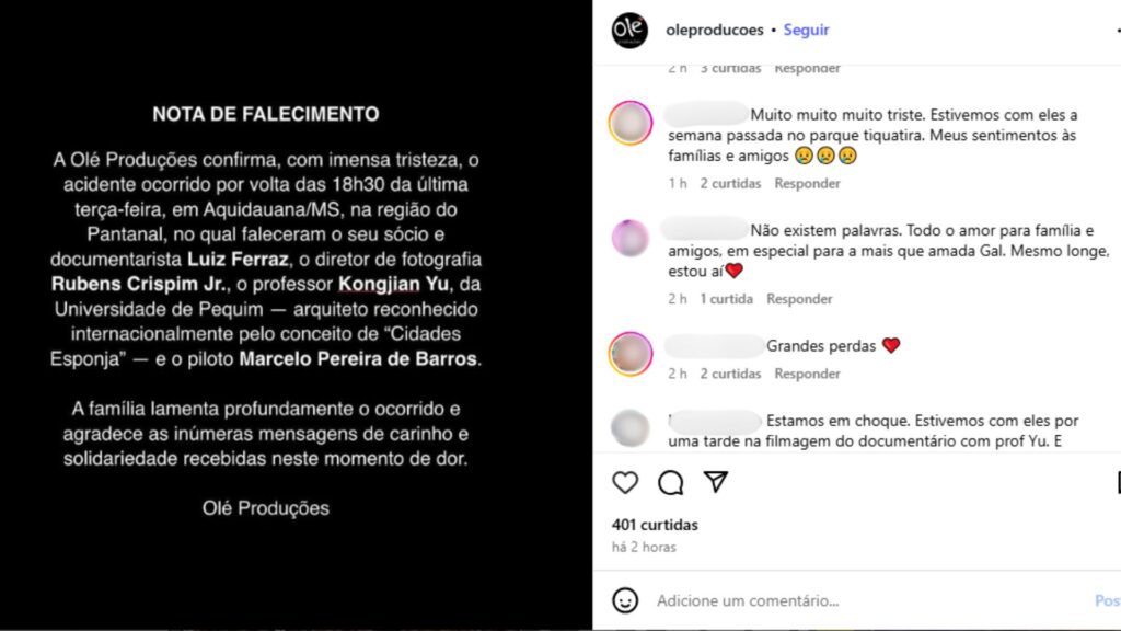 Por meio de nota de falecimento no Instagram, a empresa Olé Produções, na qual Luiz Fernando Feres da Cunha Ferraz era sócio, confirmou a morte do cinegrafista na noite desta terça-feira (23). Amigos e admiradores comentaram o talento de Luiz e a falta que ele fará.