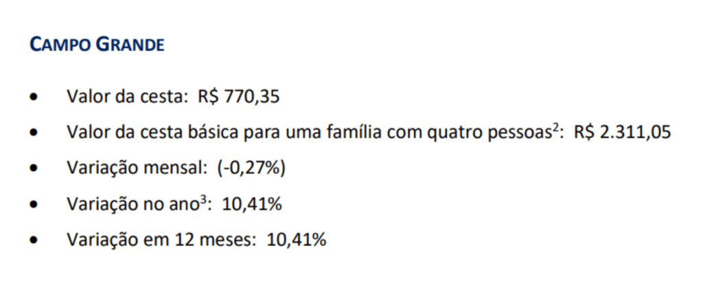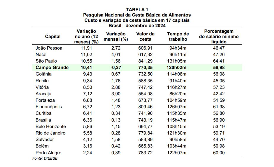 O valor da cesta ficou em R$ 770,35 no mês de dezembro de 2024 em Campo Grande. A cesta mais cara foi registrada em São Paulo (R$ 841,29), seguida de Florianópolis (R$ 809,46) e Porto Alegre (R$ 783,72).