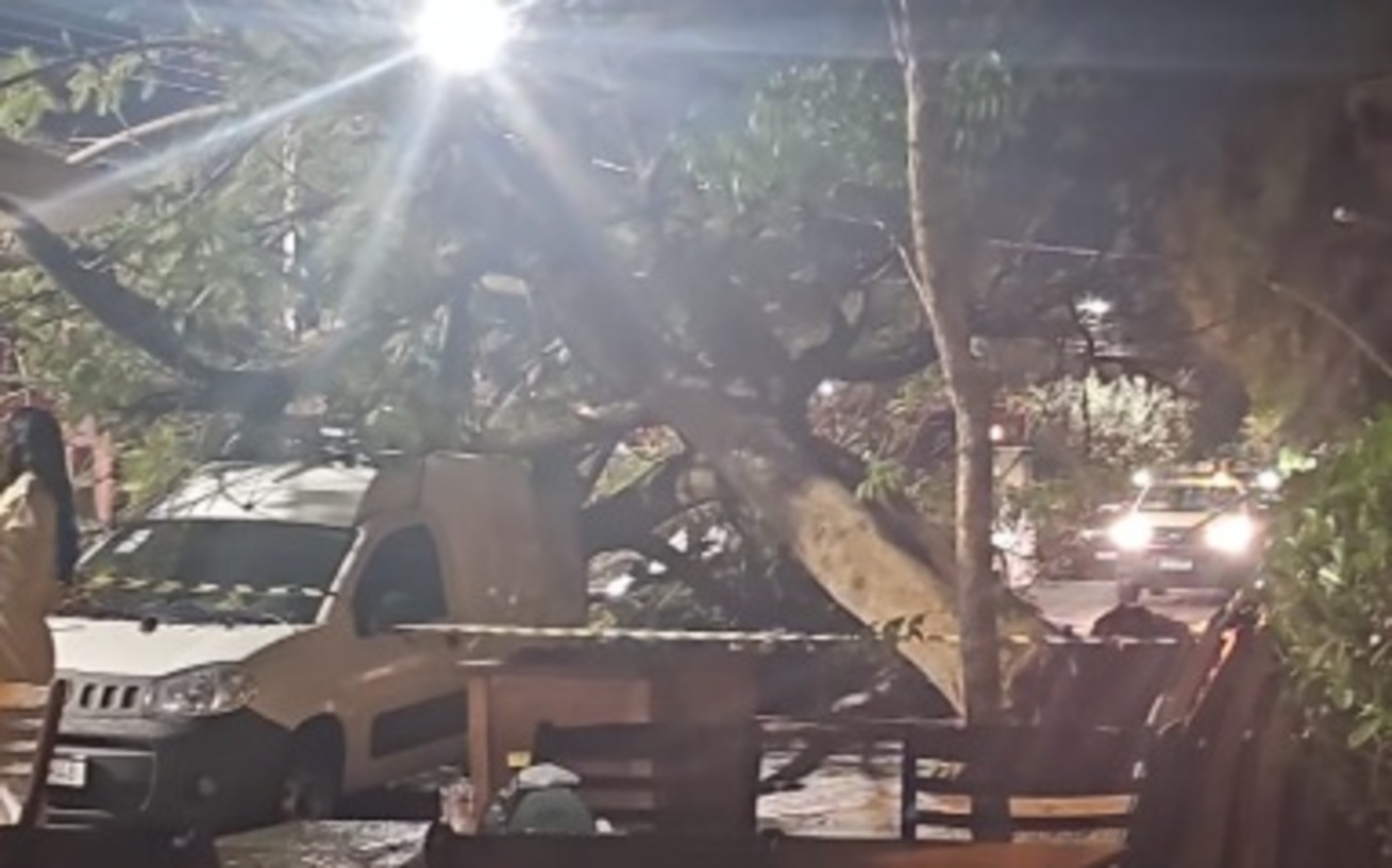 Árvore de grande porte caiu sobre dois veículos na Rua Frederico Soares, esquina com a Rua Euclides da Cunha, no Bairro Santa Fé, na noite desta sexta-feira (03). Ninguém ficou ferido.