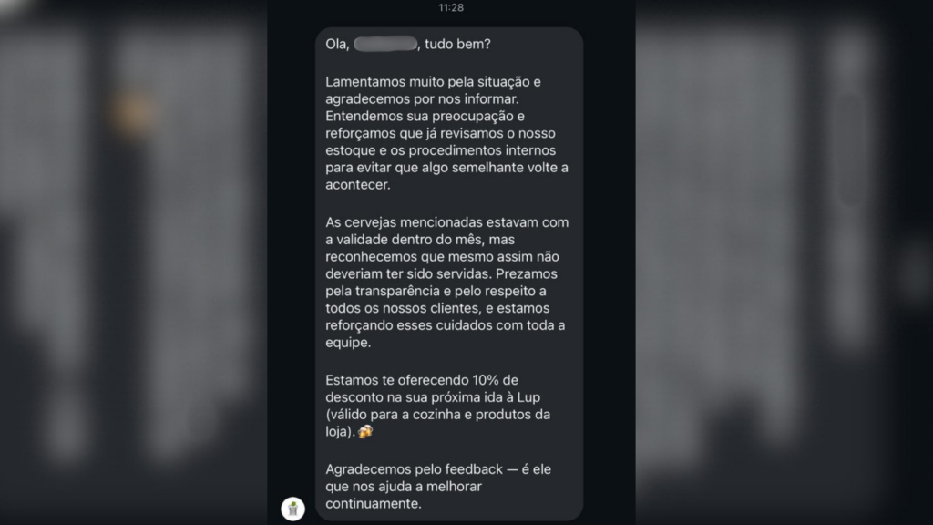 Na manhã desta quinta-feira (16), o bar enviou mensagem para o consumidor em uma rede social. No texto, eles reconhecem que as cervejas “não deveriam ter sido servidas”, mas dizem que elas “estavam com a validade dentro do mês”. Além disso, a empresa afirmou ao cliente que revisou o “estoque e os procedimentos internos para evitar que algo semelhante volte a acontecer”.