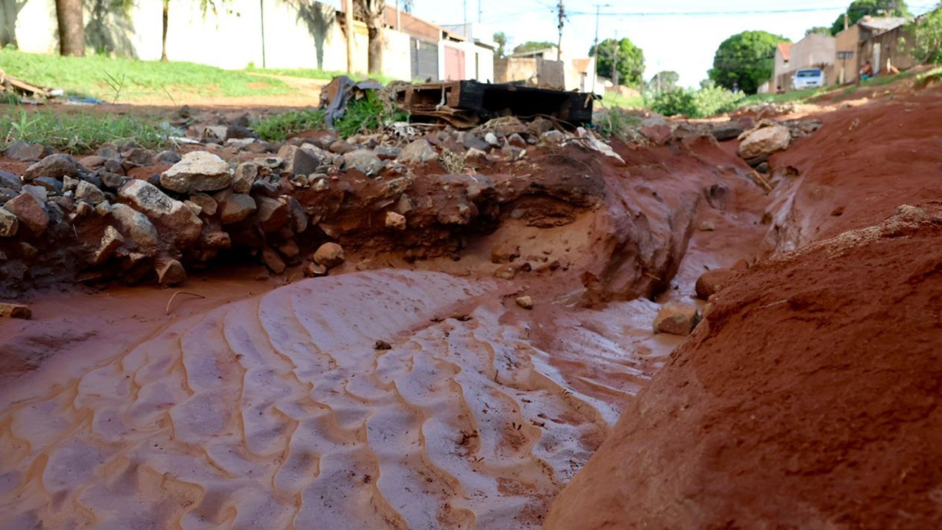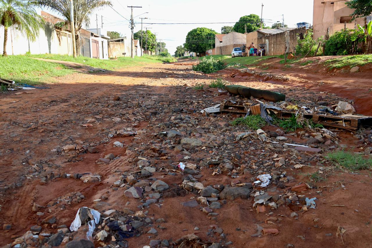Sete dias após o Jornal Midiamax presenciar um atolamento ‘ao vivo’ na Rua Lauro Muller, no bairro Jardim Los Angeles, o trecho permanece intransitável. Apesar de a cena ganhar destaque recentemente — quando nem caminhão de coleta de lixo escapou de ficar preso —, as condições da via mostram a realidade enfrentada diariamente por moradores da região.