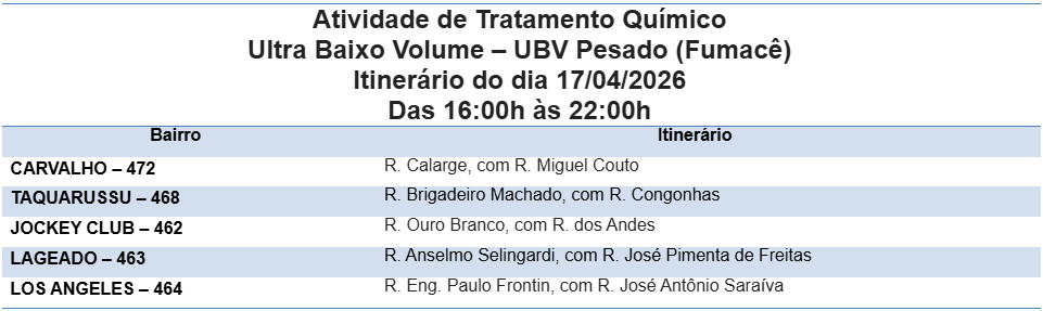 Equipes da GCEV (Gerência de Controle de Endemias Vetoriais) da Sesau (Secretaria Municipal de Saúde) percorrem ruas dos bairros Carvalho, Taquarussu, Jockey Club, Lageado e Los Angeles, das 16h às 22h.