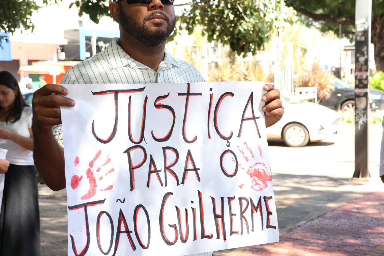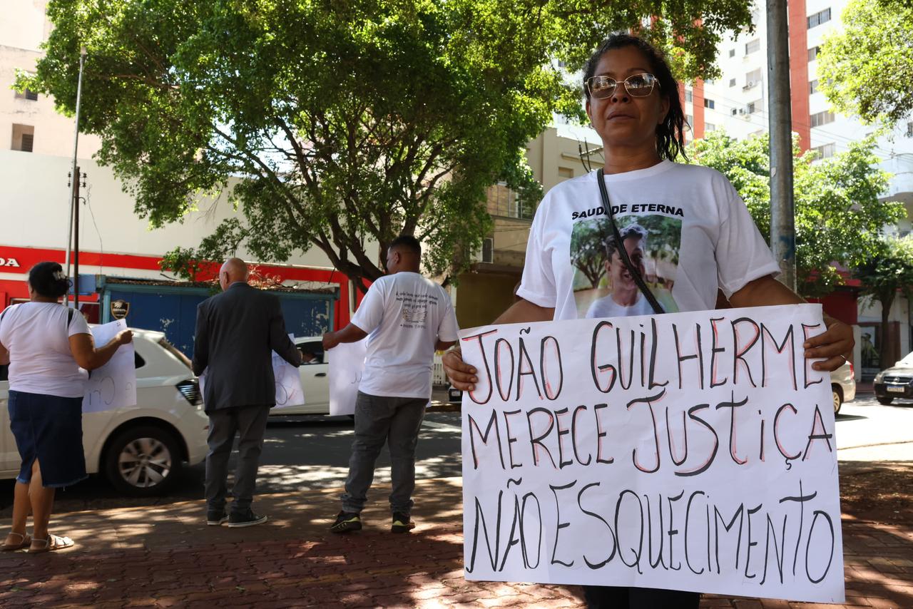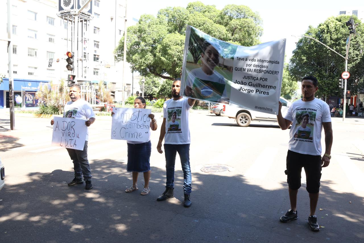 Cerca de 20 pessoas se reuniram no cruzamento da Av. Afonso Pena com a Rua 14 de Julho, na manhã deste sábado (25), vestindo camisetas com o rosto de João e carregando faixas e cartazes com as frases: “Teve a vida interrompida por descaso”, “João Guilherme merece justiça, não esquecimento”, e “Quem vai responder?”.