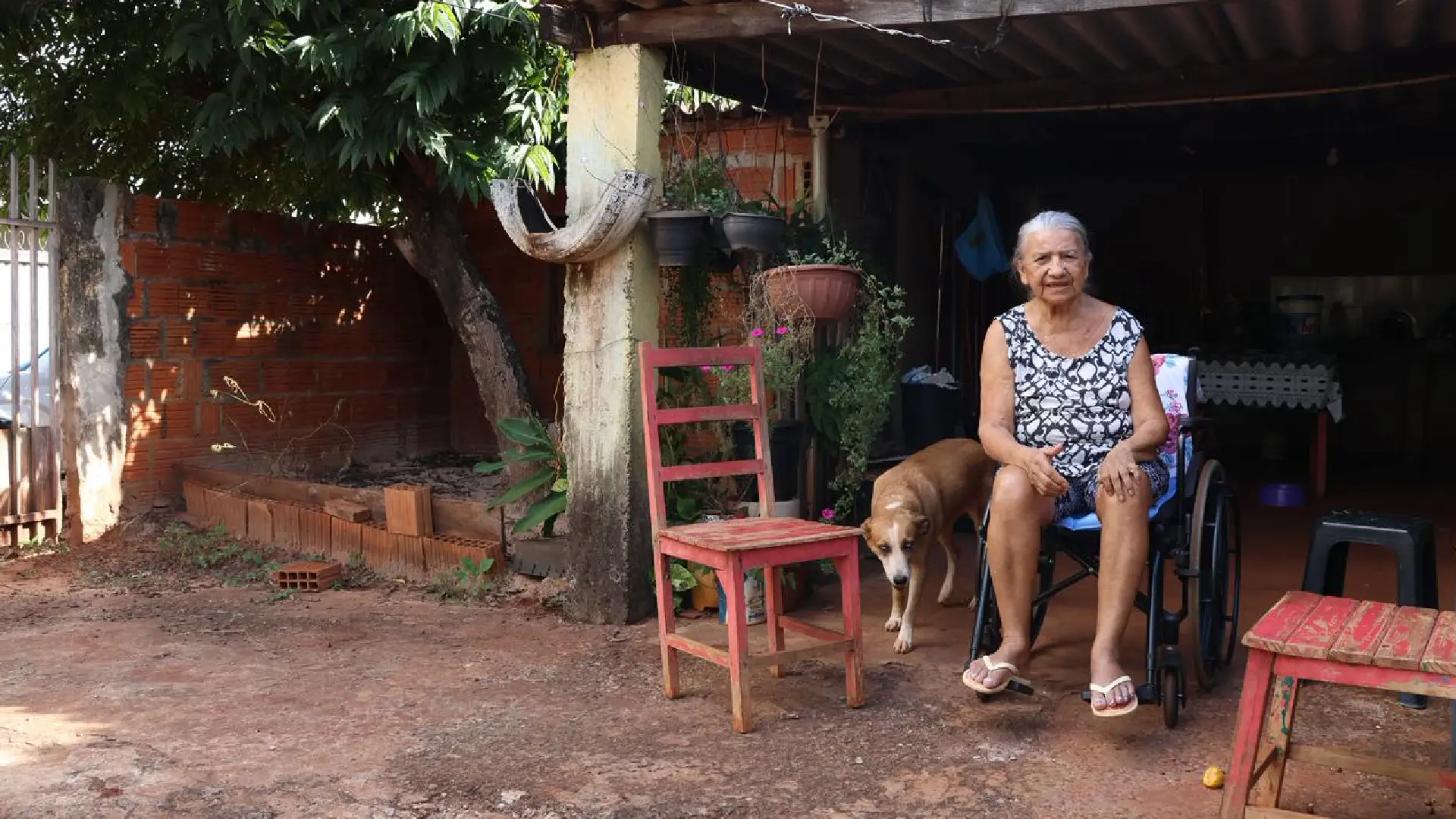 “Já moro aqui há 25 anos. Logo que comprei disseram que iam asfaltar, mas está assim até hoje. Não dá nem pra sair lá na rua, tomar um ar, porque não tem condições”, relata. Há três meses, ela passou a usar cadeira de rodas após perder os movimentos das pernas. Desde então, sair de casa se tornou ainda mais difícil.