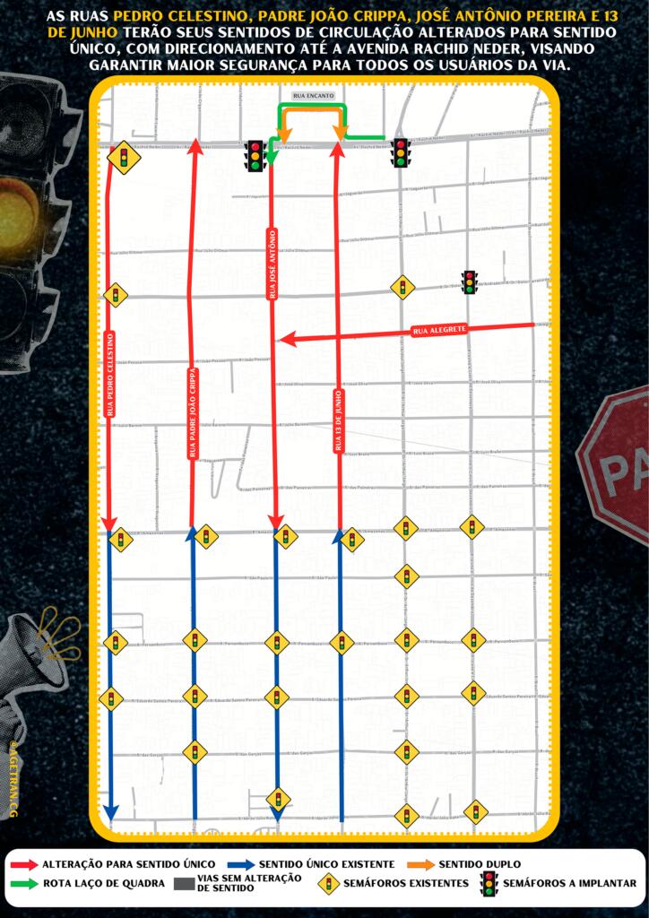 Assim, as ruas Pedro Celestino, Padre João Crippa, José Antônio e 13 de Junho, no trecho entre a Avenida Rachid Neder e a Rua Amazonas, passam a ter mão única. Já a Rua Alegrete, entre a Rua Brasil e a Rua José Antônio, também deixa de operar em mão dupla e passa a ter sentido único.