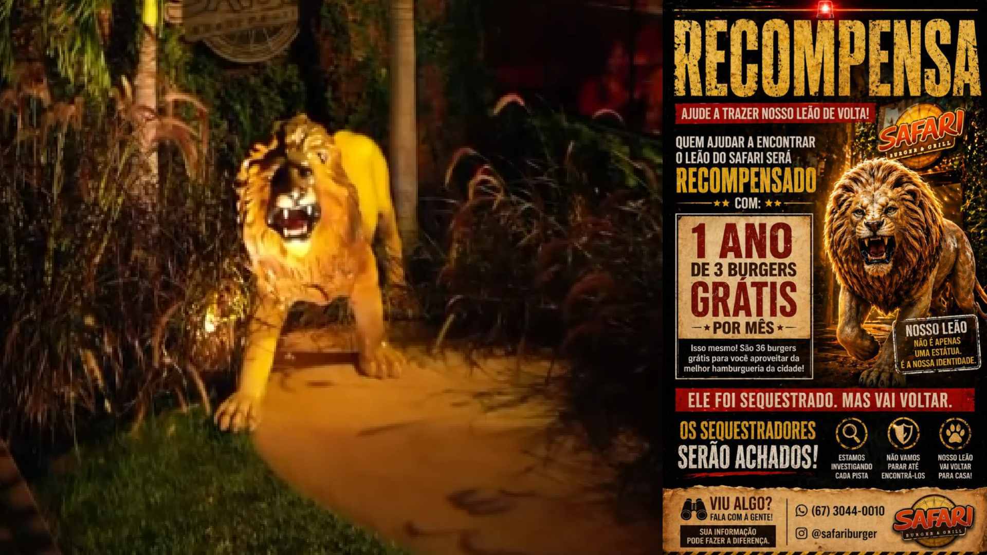 Já pensou em ganhar um ano de hambúrguer grátis? A oferta é da Safari, lanchonete no centro de Campo Grande que teve estátua furtada. O leão de 10 metros, mascote e identidade do estabelecimento, foi levado por um grupo de quatro pessoas na madrugada da sexta-feira (24).