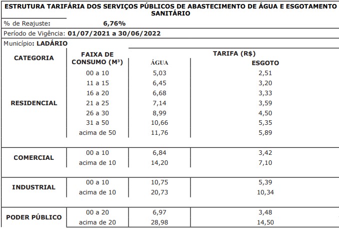 Sendo assim, o valor de 6,76% será incidente sobre os serviços públicos de abastecimento de água e de esgotamento sanitário, calculado com base na variação do IPCA/IBGE de 12 meses (período de maio de 2020 a abril de 2021).