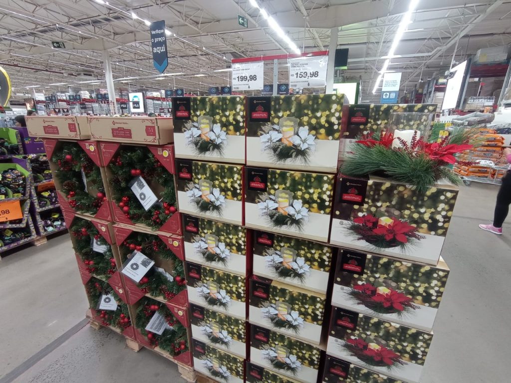Já as clássicas guirlandas são encontradas nas cores vermelha (R$ 199) e dourada (R$ 159), ambas com 51 cm. Um arranjo de mesa com flores e velas, é vendido por R$ 159,98.